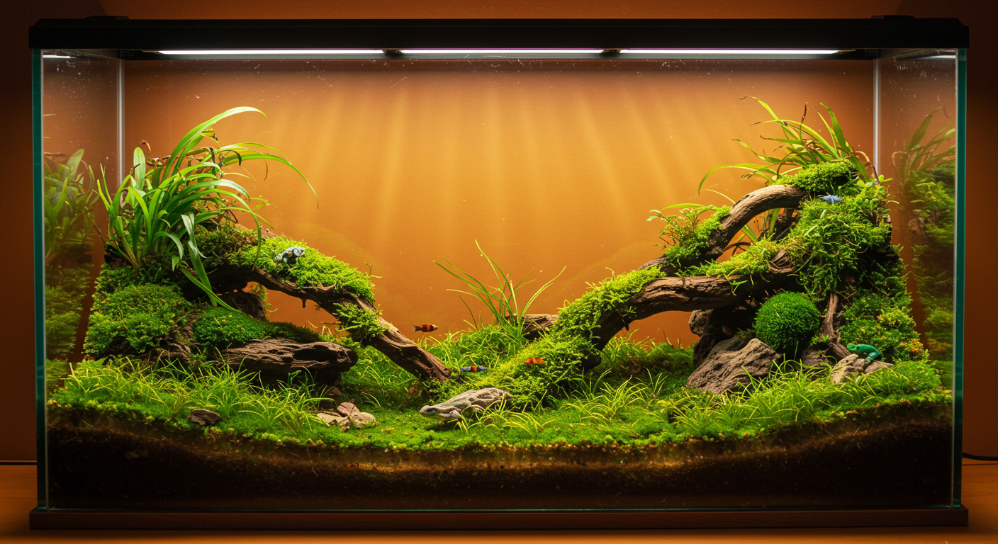 - 아쿠아테라리움 (Aquaterrarium):이름에서 알 수 있듯이, 아쿠아리움과 테라리움의 중간 형태입니다. 물의 비중이 팔루다리움보다 훨씬 높고, 물속에는 다양한 물고기와 수초를, 물 밖으로는 육상 식물과 육상 동물이 머무를 수 있는 작은 공간을 만듭니다. 주로 반수생 거북이나 악어붙이 등을 키울 때 사용해요.