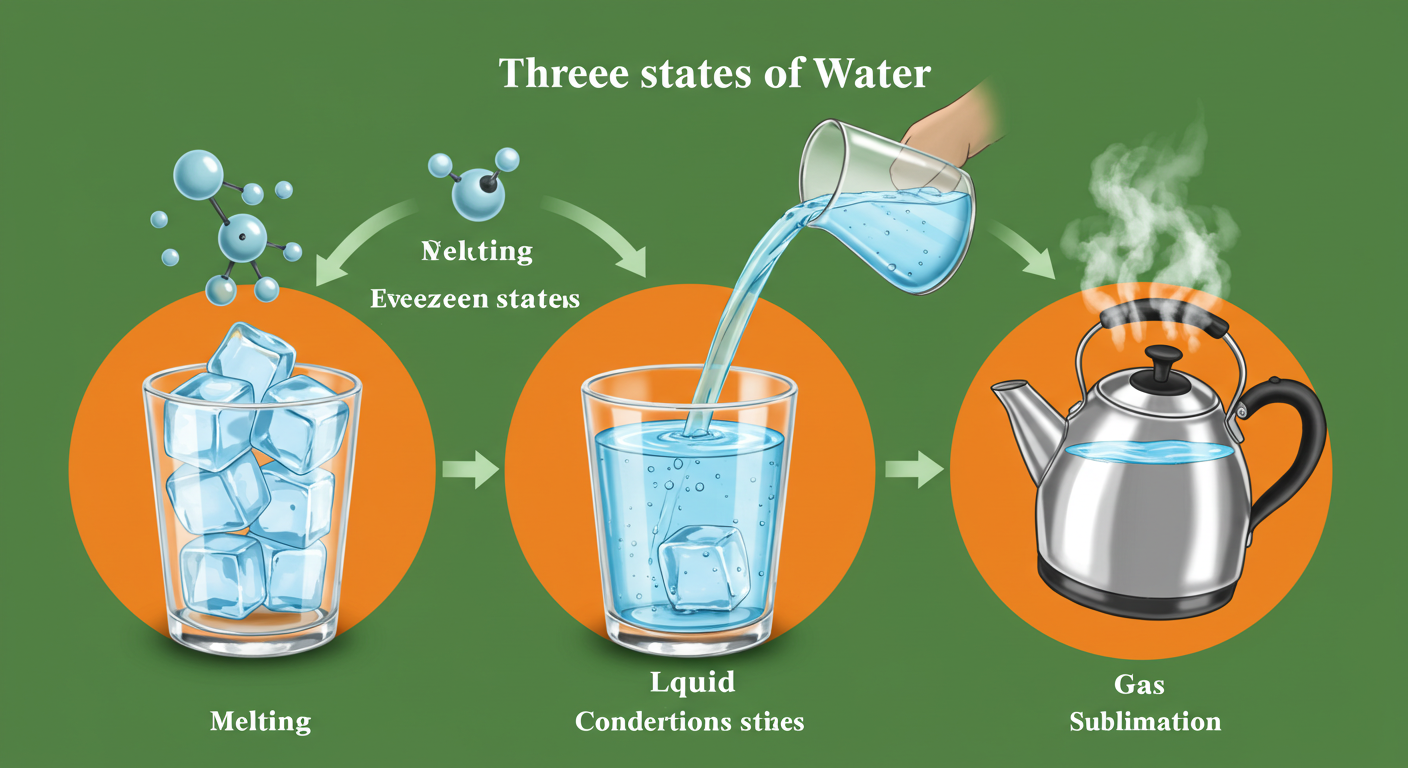 물은 온도와 압력에 따라 고체(얼음), 액체(물), 기체(수증기)라는 세 가지 모습으로 변신할 수 있어요. 이 모든 변화는 물 분자들의 움직임과 배열이 달라지면서 일어나는 물리적인 변화랍니다.
