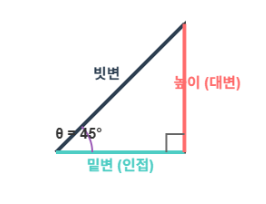 • 탄젠트 (tan 세타): 밑변 분의 높이 (또는 사인 세타 나누기 코사인 세타)