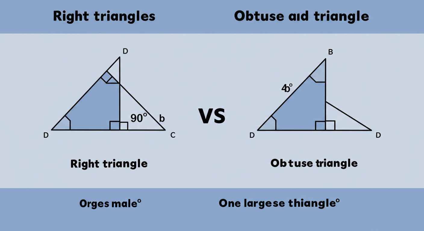 A: 직각삼각형은 한 개의 각이 직각(90°)인 삼각형이고, 둔각삼각형은 한 개의 각이 둔각(90°보다 큰 각)인 삼각형이에요. 예각삼각형은 모든 각이 뾰족해야 한다는 점이 다르답니다!