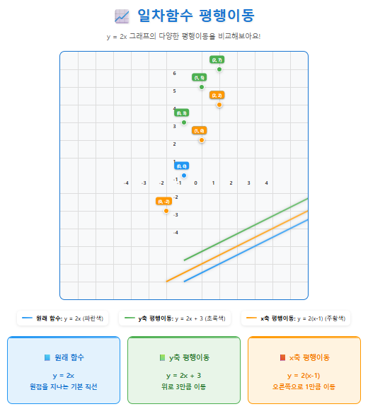1. 일차함수 평행이동은 그래프의 모양(기울기)을 유지한 채 위치만 바꾸는 것을 의미해요.