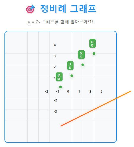 'x가 2배, 3배... 될 때 y도 2배, 3배... 되는 관계'를 정비례라고 해요. 그래프는 원점을 지나는 직선 형태를 띤답니다!